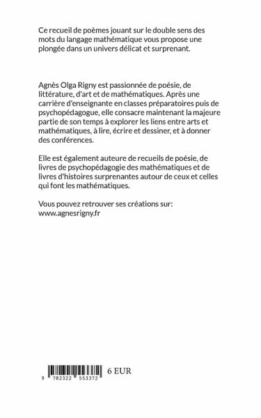 Ce recueil de poèmes jouant sur le double sens des mots du langage mathématique vous propose une plongée dans un univers délicat et surprenant. Agnès Olga Rigny est passionnée de poésie, de littérature, d'art et de mathématiques. Après une carrière d'enseignante en classes préparatoires puis de psychopédagogue, elle consacre la majeure partie de son temps à explorer les liens entre arts et mathématiques, à écrire et à dessiner, à faire des conférences. Elle est également auteure de plusieurs recueils de poésie, de livres de psychopédagogie des mathématiques et de livres d'histoires surprenantes autour des mathématiques. Vous pouvez retrouver ses créations sur www.agnesrigny.fr