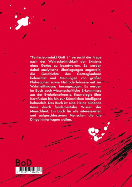 "Fantasieprodukt Gott ?" versucht die Frage nach der Wahrscheinlichkeit der Existenz eines Gottes zu beantworten. Es werden dabei analytische Überlegungen angestellt, die Geschichte des Gottesglaubens beleuchtet und Meinungen von großen Philosophen sowie Nahtoderlebnisse mit zur Wahrheitsfindung herangezogen. Es werden im Buch wissenschaftliche Erkenntnisse aus der Evolutionstheorie, Kosmologie über Kernfusion bis hin zur Künstlichen Intelligenz behandelt. Das Buch ist eine kleine bildende Reise durch fundamentales Wissen der Menschheit. Ein Buch für alle interessierten und aufgeschlossenen Menschen, die die Dinge hinterfragen wollen. Dieses Buch prägt jeden, der es liest, gibt dabei Antworthilfen auf die Ursprünge unserer Existenz, auf die Existenz einer Seele oder eines Lebens nach dem Tod. Wer es nicht gelesen hat, versäumt dieses außergewöhnliche Moment des "Blitzes der Erkenntnis".