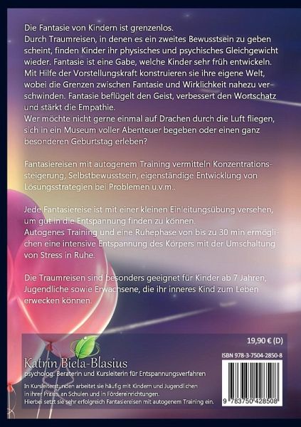 Die Fantasie von Kindern ist grenzenlos. Durch Traumreisen, in denen es ein zweites Bewusstsein zu geben scheint, finden Kinder ihr physisches und psychisches Gleichgewicht wieder. Fantasie ist eine Gabe, welche Kinder sehr früh entwickeln. Mit Hilfe der Vorstellungskraft konstruieren sie ihre eigene Welt, wobei die Grenzen zwischen Fantasie und Wirklichkeit nahezu verschwinden. Fantasie beflügelt den Geist, verbessert den Wortschatz und stärkt die Empathie.Wer möchte nicht gerne einmal auf Drachen durch die Luft fliegen, sich in ein Museum voller Abenteuer begeben oder einen ganz besonderen Geburtstag erleben?Fantasiereisen mit autogenem Training vermitteln Konzentrationssteigerung, Selbstbewusstsein, eigenständige Entwicklung von Lösungsstrategien bei Problemen u.v.m.Jede Fantasiereise ist mit einer kleinen Einleitungsübung versehen, um gut in die Entspannung finden zu können. Autogenes Training und eine Ruhephase von bis zu 30 min ermöglichen eine intensive Entspannung des Körpers mit der Umschaltung von Stress in Ruhe.Die Traumreisen sind besonders geeignet für Kinder ab 7 Jahren, Jugendliche sowie Erwachsene, die ihr inneres Kind zum Leben erwecken können.