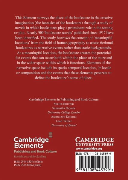This Element surveys the place of the bookstore in the creative imagination (the fantasies of the bookstore) through a study of novels in which bookstores play a prominent role in the setting or plot. Nearly 500 'bookstore novels' published since the first in 1917 have been identified.