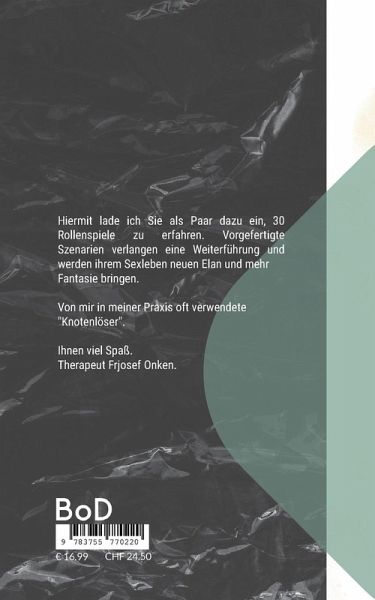 Hiermit lade ich Sie als Paar dazu ein, 30 Rollenspiele zu erfahren. Vorgefertigte Szenarien verlangen eine Weiterführung und werden ihrem Sexleben neuen Elan und mehr Fantasie bringen. Von mir in meiner Praxis oft verwendete "Knotenlöser". Ihnen viel Spaß. Therapeut Frjosef Onken.
