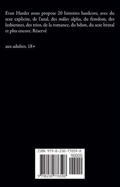 Evan Harder nous propose 20 histoires hardcore, avec du sexe explicite, de l'anal, des mâles alpha, du femdom, des lesbiennes, des trios, de la romance, du bdsm, du sexe brutal et plus encore. Réservé aux adultes. 18+