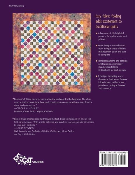 Embellish your traditional quilt with origami techniques! 22 delightful projects for quilts, vests, and pillows, with step-by-step photographs of folding instructions. Important Note about PRINT ON DEMAND Editions: You are purchasing a print on demand edition of this book. This book is printed individually on uncoated (non-glossy) paper with the best quality printers available. The printing quality of this copy will vary from the original offset printing edition and may look more saturated. The information presented in this version is the same as the latest edition. The original version of this book came with a CD. You can access the full content of this CD online at C&T's website.