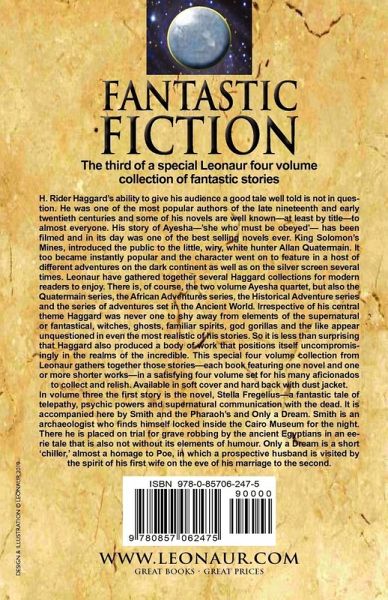 The third volume of a special Leonaur collection of fantastic stories H. Rider Haggard's ability to give his audience a good tale well told is not in question. He was one of the most popular authors of the late nineteenth and early twentieth centuries and some of his novels are well known-at least by title-to almost everyone. His story of Ayesha-'she who must be obeyed'- has been filmed and in its day was one of the best selling novels ever. King Solomon's Mines, introduced the public to the little, wiry, white hunter Allan Quatermain. It too became instantly popular and the character went on to feature in a host of different adventures on the dark continent as well as on the silver screen several times. Leonaur have gathered together several Haggard collections for modern readers to enjoy. There is, of course, the two volume Ayesha quartet, but also the Quatermain series, the African Adventures series, the Historical Adventure series and the series of adventures set in the Ancient World. Irrespective of his central theme Haggard was never one to shy away from elements of the supernatural or fantastical, witches, ghosts, familiar spirits, god gorillas and the like appear unquestioned in even the most realistic of his stories. So it is less than surprising that Haggard also produced a body of work that positions itself uncompromisingly in the realms of the incredible. This special four volume collection from Leonaur gathers together those stories-each book featuring one novel and one or more shorter works-in a satisfying four volume set for his many aficionados to collect and relish. Available in soft cover and hard back with dust jacket. In volume three the first story is the novel, Stella Fregelius-a fantastic tale of telepathy, psychic powers and supernatural communication with the dead. It is accompanied here by Smith and the Pharaoh's and Only a Dream. Smith is an archaeologist who finds himself locked inside the Cairo Museum for the night. There he is placed on trial for grave robbing by the ancient Egyptians in an eerie tale that is also not without its elements of humour. Only a Dream is a short 'chiller,' almost a homage to Poe, in which a prospective husband is visited by the spirit of his first wife on the eve of his marriage to the second.