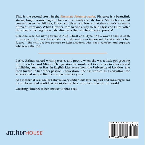 This is the second story in the Fantastic Florence series. Florence is a beautiful, strong, bright orange bag who lives with a family that she loves. She feels a special connection to the children, Elliott and Elyse, and learns that they experience many different emotions. When Florence tries to find a way to help Elyse and Elliott after they have a bad argument, she discovers that she has magical powers! Florence uses her new powers to help Elliott and Elyse find a way to talk to each other again. Florence is so happy and she makes an important decision about her future. She will use her powers to help children who need comfort and support whenever she can.