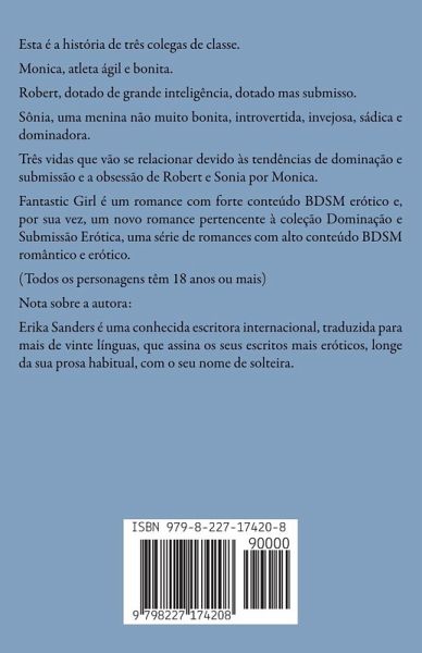 Esta é a história de três colegas de classe. Monica, atleta ágil e bonita. Robert, dotado de grande inteligência, dotado mas submisso. Sônia, uma menina não muito bonita, introvertida, invejosa, sádica e dominadora. Três vidas que vão se relacionar devido às tendências de dominação e submissão e a obsessão de Robert e Sonia por Monica. Fantastic Girl é um romance com forte conteúdo BDSM erótico e, por sua vez, um novo romance pertencente à coleção Dominação e Submissão Erótica, uma série de romances com alto conteúdo BDSM romântico e erótico. (Todos os personagens têm 18 anos ou mais) Nota sobre a autora: Erika Sanders é uma conhecida escritora internacional, traduzida para mais de vinte línguas, que assina os seus escritos mais eróticos, longe da sua prosa habitual, com o seu nome de solteira.