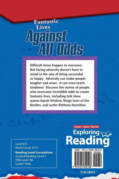 Difficult times happen to everyone. But facing adversity doesn't have to stand in the way of being successful or happy. Adversity can make people tougher, wiser, and more compassionate. Bethany Hamilton, Oprah Winfrey, Ringo Starr, and Matt Moniz are examples of people who overcame incredible odds and achieved success. Learn about their inspirational stories with this informational text that is packed with fun facts, fascinating sidebars, and high-interest content. Featuring TIME© content and images, this full-color nonfiction book has text features such as a glossary, an index, and a table of contents to engage students in reading as they build their comprehension, vocabulary, and reading skills. The Reader's Guide and extended Try It! activity increase understanding of the material, and develop higher-order thinking. Check It Out! offers print and online resources for additional reading. Keep students reading from cover to cover with this captivating text!