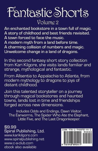 An enchanted bookstore in a town full of magic. A story of childhood and best friends revisited. A town forced to face the music. A modern myth from a land before time. A charming collision of numbers and magic. Unwelcome change in a land of dragons. In this second fantasy short story collection from Kari Kilgore, she visits lands familiar and strange, mythological and fantastic. From Allsentia to Appalachia to Atlanta, from modern mythology to dragons to joys of distant childhood. Join this talented storyteller on a journey through magical bookstores and haunted towns, lands lost in time and friendships forged across new dimensions. Includes Odds and Endings, Dawn Visitor, The Earworms, The Spider Who Ate the Elephant, Little Five, and The Last Dragonkeeper. Odds and Endings: Visit an enchanted bookstore in a town full of magic. Chris Ramsey grew up visiting the Odds and Endings Bookstore in Lightning Gap, Virginia. Wandering the shelves. Finding endless adventures in the pages. Wishing he helped create the magic. Years later, Chris gets his chance. What would you do for the opportunity of a lifetime? Dawn Visitor: A beloved dog brings a special gift, especially to a young girl’s life. One that lasts and endures no matter how many years pass. Toby welcomes Ellie home as only a first best friend can. A touching story of childhood and best friends revisited. The Earworms: What if your whole town had to face the music? Estonoa, Virginia. A lovely little town tucked deep in the Blue Ridge Mountains. Hiking and ATV trails. Kayaking along the scenic Clinch River. A thriving community focused on the future. Erin Evans loves her hometown, except for one thing. The Earworms. Will Erin find the answer before the music drives her and everyone else crazy? The Spider Who Ate the Elephant: A Modern Myth. An eerie natural phenomenon. In the distant past, in a distant land... Grandmother Spider faces a sad problem far too big and difficult for her to solve. The end of her family and all the creatures in her land. Find out how her triumph echoes from then to now, and into forever. A tale of compassion, survival, and love. Little Five: Barry Evans: An oddball in the oddest land of all. A gray-suited accountant navigating colorful hair, crazy clothing, and questionable businesses. After three months in Little Five, nothing surprises Barry anymore. Until the day he meets a true stranger in town. What happens when numbers meet magic? The Last Dragonkeeper: Wyja, Senior Dragonkeeper of the Upper Abramshire Academy, tends to young dragons and keepers alike. Each group challenging, and exhausting, in their own way. Unwelcome change sets in when dragon birthrates drop to dangerous levels. No one knows why. Can Wyja solve the problem before it’s too late?