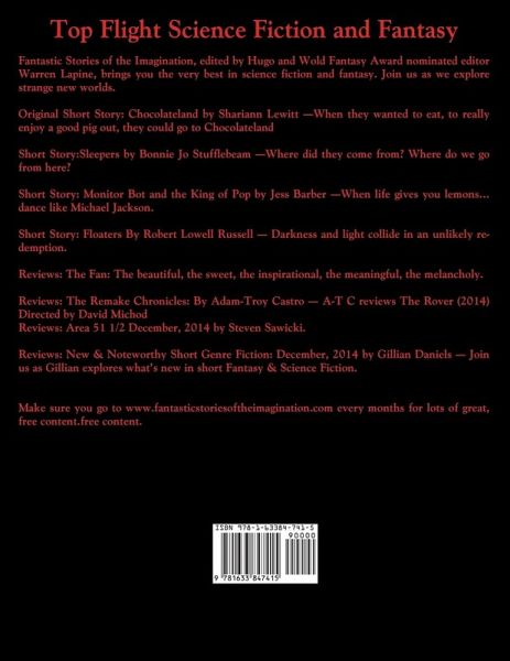 Fantastic Stories of the Imagination, edited by Hugo and Wold Fantasy Award nominated editor Warren Lapine, brings you the very best in science fiction and fantasy. Join us as we explore strange new worlds. Original Short Story: Chocolateland by Shariann Lewitt -When they wanted to eat, to really enjoy a good pig out, they could go to Chocolateland Short Story:Sleepers by Bonnie Jo Stufflebeam -Where did they come from? Where do we go from here? Short Story: Monitor Bot and the King of Pop by Jess Barber -When life gives you lemons... dance like Michael Jackson. Short Story: Floaters By Robert Lowell Russell - Darkness and light collide in an unlikely redemption. Reviews: The Fan: The beautiful, the sweet, the inspirational, the meaningful, the melancholy. Reviews: The Remake Chronicles: By Adam-Troy Castro - A-T C reviews The Rover (2014) Directed by David Michod Reviews: Area 51 1/2 December, 2014 by Steven Sawicki. Reviews: New & Noteworthy Short Genre Fiction: December, 2014 by Gillian Daniels - Join us as Gillian explores what's new in short Fantasy & Science Fiction. Make sure you go to www.fantasticstoriesoftheimagination.com every months for lots of great, free content.free content.