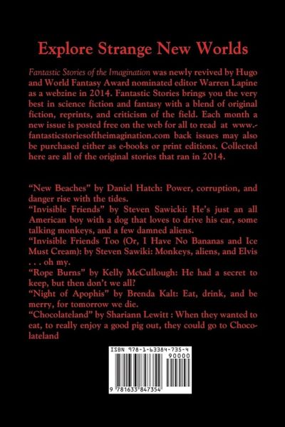 Fantastic Stories of the Imagination was newly revived by Hugo and World Fantasy Award nominated editor Warren Lapine as a webzine in 2014. Fantastic Stories brings you the very best in science fiction and fantasy with a blend of original fiction, reprints, and criticism of the field. Each month a new issue is posted free on the web for all to read at www.fantasticstoriesoftheimagination.com back issues may also be purchased either as e-books or print editions. Collected here are all of the original stories that ran in 2014. "New Beaches" by Daniel Hatch: Power, corruption, and danger rise with the tides. "Invisible Friends" by Steven Sawicki: He's just an all American boy with a dog that loves to drive his car, some talking monkeys, and a few damned aliens. "Invisible Friends Too (Or, I Have No Bananas and Ice Must Cream): by Steven Sawiki: Monkeys, aliens, and Elvis . . . oh my. "Rope Burns" by Kelly McCullough: He had a secret to keep, but then don't we all? "Night of Apophis" by Brenda Kalt: Eat, drink, and be merry, for tomorrow we die. "Chocolateland" by Shariann Lewitt : When they wanted to eat, to really enjoy a good pig out, they could go to Chocolateland