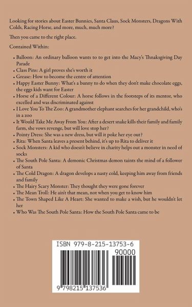 Looking for stories about Easter Bunnies, Santa Claus, Sock Monsters, Dragons With Colds, Racing Horses, and more, much, much more? Then you came to the right place. Contained within: Balloon: An ordinary balloon wants to get into the Macy's Thanksgiving Day Parade Class Pins: A girl proves she worth it Grease: How to become the centre of attention Happy Easter Bunny: What's a bunny to do when they don't make chocolate eggs, the eggs kids want for Easter Horse of a Different Colour: A horse follows in the footsteps of its mentor, who excelled and discriminated against I Love You To The Zoo: A grandmother elephant searches for her grandchild, who's in a zoo It Would Take Me Away From You: After a desert snake takes away their parents, they vow revenge, but can love stop them? Pointy Dress: She wants a new dress, but will it poke her eye out? Rita: When a present is left behind, it's up to Rita to deviler it, will Santa save Rita whose Christmas magic is at stake thanks to a bad storm? Sock Monsters: A kid who doesn't believe in charity helps out a monster in need of socks The South Pole Santa: A demonic Christmas critter taints the mind of a follow of Santa The Cold Dragon: A dragon develops a nasty cold, keeping him away from friends and family The Hairy Scary Monster: They thought they were gone forever The Mean Troll: He ain't that mean, not when you get to know him The Town Shaped Like A Heart: All she wanted was to make a wish, but he decided to not grant it Who Was The South Pole Santa: How the South Pole Santa came to be