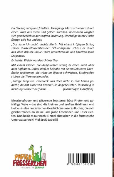Die See lag ruhig und friedlich. Meerjunge Maris schwamm durch einen Wald aus roten und gelben Korallen. Anemonen wiegten sich gemächlich in der sanften Strömung. Unzählige bunte Fische flitzten eilig hin und her."Das kann ich auch", dachte Maris. Mit einem kräftigen Schlag seiner dunkelblauschillernden Schwanzflosse schoss er durch das klare Wasser. Blaue Haare umwehten ihn und kitzelten seine Stupsnase.Er lachte. Welch wunderschöner Tag. Mit einem kleinen Freudenjauchzer schlug er einen Salto über dem Riffkamm. Dabei stieß er beinahe mit einem Schwarm Thunfische zusammen, die träge im Wasser schwebten. Erschrocken stoben die Tiere auseinander."Salzige Seegurke! Erschreck' uns doch nicht so. Wir haben gedacht, du bist einer von denen." Ein angedeuteter Flossenzeig in Richtung Wasseroberfläche. ... (Dominique Goreßen)Meerjungfrauen und glitzernde Seesterne, böse Piraten und gefräßige Wale - das sind die kleinen und großen Heldinnen und Helden in den fantastischen Geschichten unseres Buches, die sich gleichermaßen an kleine und große Leserinnen und Leser richten. Nun heißt es nur noch: Einmal abtauchen in die fantastische Unterwasserwelt! Viel Spaß dabei!!!