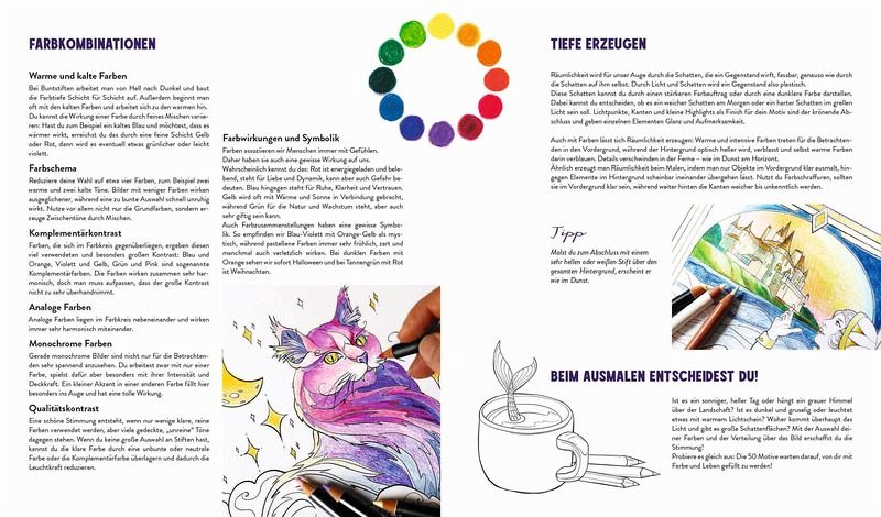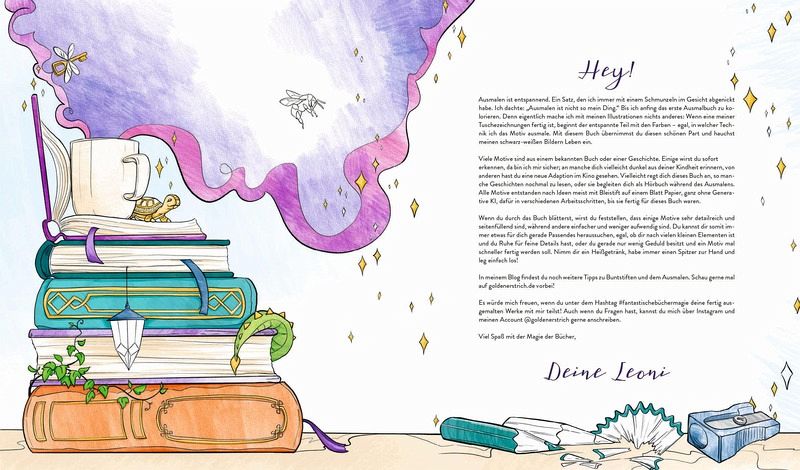 50 fantastische Ausmalmotive aus der Welt der Bücher für eine cosy AuszeitVon Nymphen und Zauberern, zu berühmten Bibliotheken und Büchern, Agatha Christie und RomancePraktische Grundlagen zu Farbenlehre, Material und Maltechnik