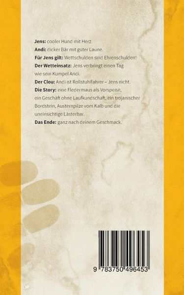 Jens: cooler Hund mit Herz.Andi: dicker Bär mit guter Laune.Für Jens gilt: Wettschulden sind Ehrenschulden!Der Wetteinsatz: Jens verbringt einen Tag wie sein Kumpel Andi.Der Clou: Andi ist Rollstuhlfahrer. Jens nicht. Die Story: eine Fledermaus als Vorspeise, ein Geschäft ohne Laufkundschaft, ein trojanischer Bordstein, Austernpilze vom Kalb und die uneinsichtige Lästerbar.Das Ende: ganz nach deinem Geschmack.
