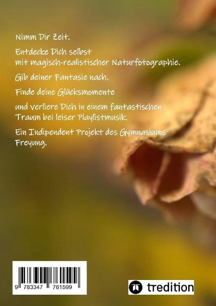 Nimm Dir Zeit. Entdecke Dich selbst mit magisch-realistischer Naturfotographie. Gib deiner Fantasie nach. Finde deine Glücksmomente und verliere Dich in einem fantastischen Traum bei leiser Playlistmusik.Das Buch ist für alle Naturliebhaber, spirituelle Sucher, Genießer und Tagträumer gedacht. Es enthält neben einer wunderschönen Serie an Fotographien im künstlerischen Stil des Magical Realism viele träumerische Anregungen und Inspirationen zu den Fotos und einen Link zur Spotify-Playlist zum Buch.Ein Indipendent Projekt des Gymnasiums Freyung.