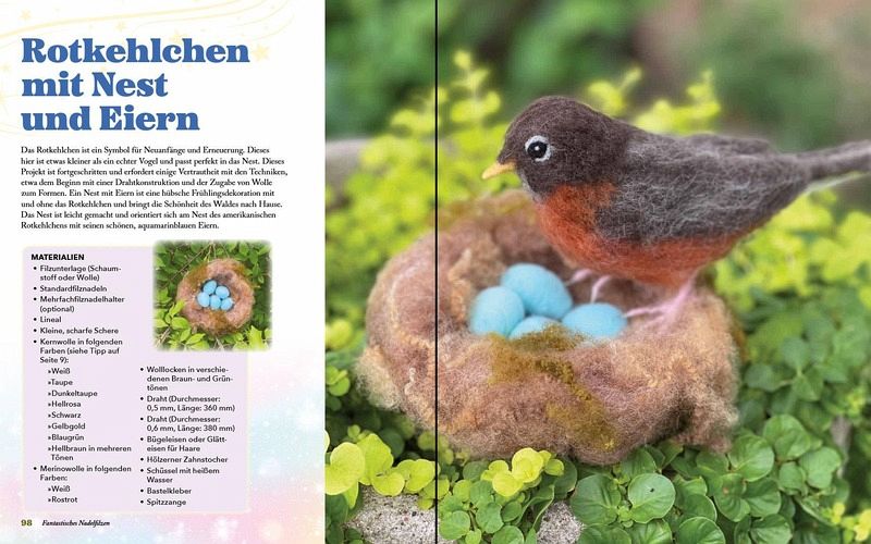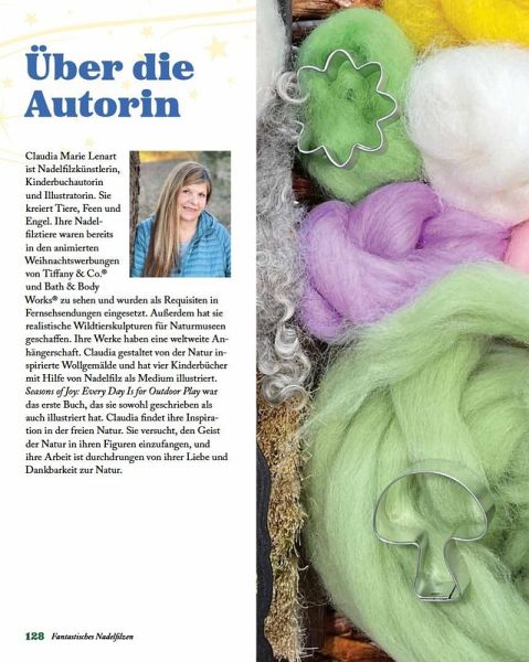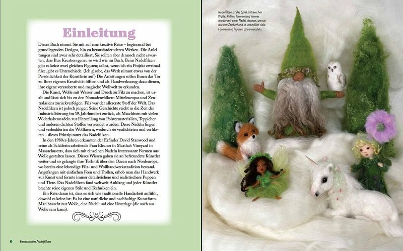 Nadelfilzen ist quasi die "kleine Schwester" vom Nassfilzen. Dabei werden die Wollfasern nicht mit Wasser und Seife geknetet, um verbunden zu werden, sondern sie werden durch das oftmalige Einstechen einer Nadel miteinander verbunden. Die Technik ist demnach noch einfacher und wird gerne als Einstieg ins Filzen - vor allem auch für Kinder - empfohlen. Außerdem lassen sich durch die Technik des Nadelfilzens wesentlich feinere Gesichter, Tiere und Pflanzen gestalten als beim Nassfilzen.Nach der kurzen Einleitung über Material, Werkzeug und Technik folgen 13 märchenhafte Projekte: So werden Einhornfohlen ebenso Elfen und Wichtel, Rotkehlchen, Kaninchen, Pilze, Blumen und Bäume gestaltet.Jedes Projekt wird mit vielen Schritt-für-Schritt-Bildern dargestellt und dabei werden weitere Techniken vorgestellt, wie z. B. das Gestalten der zarten Vogelbeine oder das Filzen der zarten Gesichtchen unserer Waldfreunde.