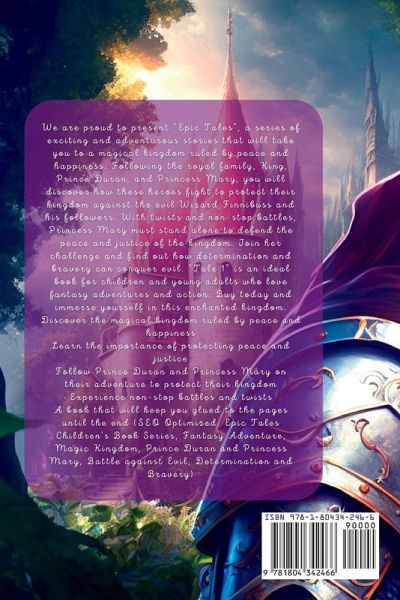 We are pleased to present "Epic Fairy Tales," a series of exciting and and adventure-filled stories that will take you to a fantastic kingdom ruled by peace and happiness. Following the royal family, the king, Prince Duran and Princess Mary, you will discover how these heroes struggle to protect their kingdom against an evil Sorcerer Finnibuss and his followers. With twists and turns and nonstop battles, Princess Mary will be forced to fight alone to protect the peace and justice of the kingdom. Face the challenge with her and discover how determination and courage can win against evil. "Fairy Tale 1" is an ideal book for children and young people who love fantastic adventures and action. Buy today and immerse yourself in this enchanted realm.