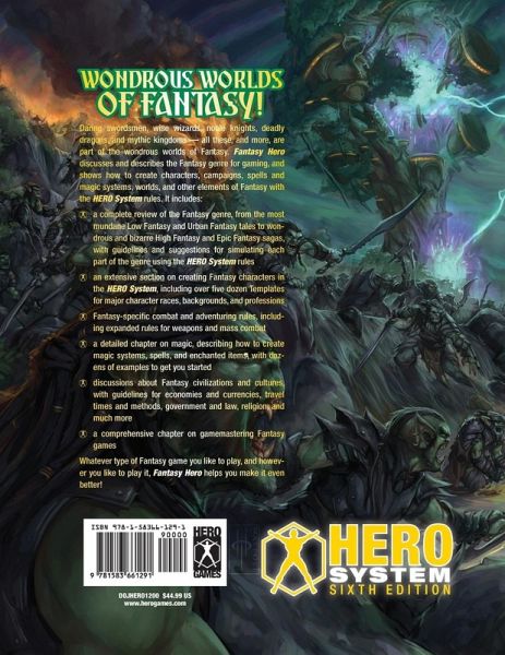 Daring swordsmen, wise wizards, noble knights, deadly dragons, and mythic kingdoms — all these, and more, are part of the wondrous worlds of Fantasy. Fantasy Hero discusses and describes the Fantasy genre for gaming, and shows how to create characters, campaigns, spells and magic systems, worlds, and other elements of Fantasy with the HERO System rules.