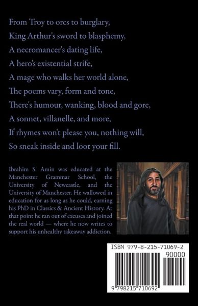 From Troy to orcs to burglary, King Arthur's sword to blasphemy, A necromancer's dating life, A hero's existential strife, A mage who walks her world alone, The poems vary, form and tone, There's humour, wanking, blood and gore, A sonnet, villanelle, and more, If rhymes won't please you, nothing will, So sneak inside and loot your fill.