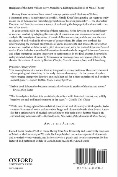 Fantasy Pieces examines from several vantage points a vital life-force of Robert Schumann's music, namely metrical conflict. Harald Krebs's imaginative yet rigorous study makes use of Schumann's fascinating projections of his own personality--the characters Florestan and Eusebius--as one means of addressing the biographical and aesthetic context of the music. In counterpoint with the remarks of these personae, Krebs develops an original theory of metrical conflict by adapting the concepts of consonance and dissonance to metrical analysis. He investigates how states of metrical dissonance arise, and shows how they are manipulated and resolved in the course of compositions. He offers new methods for understanding the metrical progressions of entire works or movements, and studies the interaction of metrical conflict with form, with pitch structure, and with the texts of Schumann's vocal works. Krebs includes a wealth of illustrations from the whole range of Schumann's work and offers numerous insights important for performance. In the final chapter, he provides richly detailed studies of pieces by Schumann in various genres, interspersing them with shorter discussions of music by Berlioz, Chopin, Clara Schumann, Ives, and Schoenberg. This is a book that will appeal not only to students and scholars of music theory, but to all musicians interested in the life, work, and unique personality of Robert Schumann.