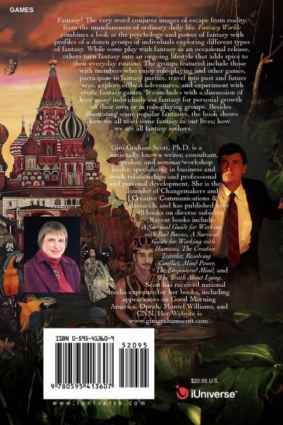 Fantasy! The very word conjures images of escape from reality, from the mundaneness of ordinary daily life. Fantasy Worlds combines a look at the psychology and power of fantasy with profiles of a dozen groups of individuals exploring different types of fantasy. While some play with fantasy as an occasional release, others turn fantasy into an ongoing lifestyle that adds spice to their everyday routines. The groups featured include those with members who enjoy role-playing and other games, participate in fantasy parties, travel into past and future eras, explore offbeat adventures, and experiment with erotic fantasy games. It concludes with a discussion of how many individuals use fantasy for personal growth on their own or in role-playing groups. Besides illustrating some popular fantasies, the book shows how we all need some fantasy in our lives; how we are all fantasy seekers.