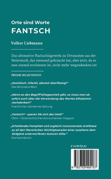 ,,Fantsch - Orte sind Worte'' ist das Nachschlagewerk zu Ortsnamen, das niemand gebraucht hat, aber jetzt, da es nun einmal veröffentlicht wurde, nicht mehr wegzudenken ist!Man liest sie auf Tafeln und Hinweisschildern, in Zeitungsartikeln und auf Landkarten - und man nimmt sie als Gott gegeben hin ohne über ihre wahre Bedeutung nachzudenken: die Ortsnamen. Dabei exisitiert sogar eine eigene Forschung, die - zugegeben - ein bisschen klingt wie eine seltene Krankheit: die Toponomie, zu deutsch Ortsnamenkunde.Mit derlei seriöser Wissenschaft hat der Autor dieses Buches, Volker Liebmann, allerdings exakt gar nichts am Hut. ,,Fantsch - Orte sind Wort'' ist die ultimative und gänzliche unernst gemeinte Fibel zu den (fiktiven) Bedeutungen der Ortsnamen in der Steiermark.Garantiert frei erfunden, mit Sicherheit historisch unbelegt!