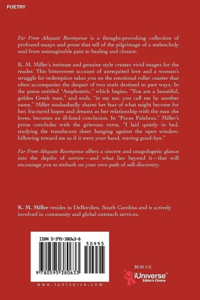 Far From Adequate Recompense is a thought-provoking collection of profound essays and prose that tell of the pilgrimage of a melancholy soul from unimaginable pain to healing and closure. K. M. Miller's intimate and genuine style creates vivid images for the reader. This bittersweet account of unrequited love and a woman's struggle for redemption takes you on the emotional roller coaster that often accompanies the despair of two souls destined to part ways. In the poem entitled 'Amphoteric," which begins, 'You are a beautiful, golden Greek man," and ends, 'in my ear, you call me by another name," Miller unabashedly shares her fear of what might become for her, fractured hopes and dreams as her relationship with the man she loves, becomes an ill-fated conclusion. In 'Prosopon," Miller's prose concludes with the grievous verse, 'I laid quietly in bed studying the translucent sheer hanging against the open window, billowing towards me as if it was your hand, waving goodbye." Far From Adequate Recompense offers a sincere and unapologetic glance into the depths of sorrow-and what lies beyond it-that will encourage you to embark on your own path of self-discovery.
