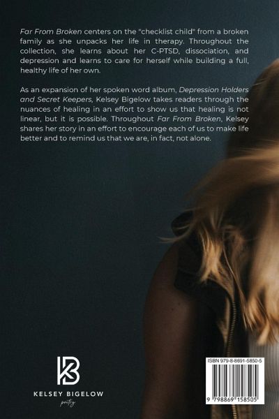 Far From Broken centers on the "checklist child" from a broken family as she unpacks her life in therapy. Throughout the collection, she learns about her C-PTSD, dissociation, and depression and learns to care for herself while building a full, healthy life of her own. As an expansion of her spoken word album, Depression Holders and Secret Keepers, Kelsey Bigelow takes readers through the nuances of healing in an effort to show us that healing is not linear, but it is possible. Throughout Far From Broken, Kelsey shares her story in an effort to encourage each of us to make life better and to remind us that we are, in fact, not alone.