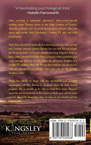 "A masterful look at control and manipulation" - Jess Kitching After receiving a substantial inheritance, thirty-seven-year-old aspiring writer, Theresa, moves to the High Country of Victoria, Australia, to finally write the novel she had always planned. Here, she meets and marries Rick Goodman, a former TV star and local entrepreneur. More than a decade her senior, Rick is charming and successful, and the most lovingly attentive partner Theresa has ever had. He encourages her dreams to write a novel and rekindles her long-forgotten desire to have a child. Life on their idyllic Alpine property is bliss, until Rick gets a text message from his ex-wife, Anita, the glamorous daughter of a wealthy TV producer. Rick tells Theresa that Anita has run off overseas with her new boyfriend, and that they must care for his teenage daughter, Chloe. While her efforts to bond with her bewildered and resentful stepdaughter fall flat, Theresa is overjoyed when she finds herself pregnant. But as months go by with no word from Anita, Theresa's search for answers leads her to the women in Rick's past, and she must uncover the truth about their lives, in time to save herself and her unborn child. "A fascinating psychological story" - Katelin Farnsworth