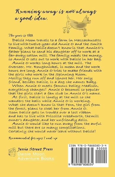 The year is 1809. Daisie Moon, a doll who can walk, talk, and think for herself, travels to a farm in Massachusetts to live with twelve-year-old Annie O and the Smith Family. What Daisie doesn’t know is that Annie O‘s father plans to send his daughter off to work at a far-away cotton mill. The family needs the money, so Annie O sets out to work with Daisie in her bag. Annie O works long hours at the mill. The overseer is mean and the work hours are long. Annie O tries to make friends with the girls who work in the Spinning Room. Mostly they run off and ignore her. Her only friend, besides Daisie, is a dog she names Baby. When Annie O meets the famous Dolley Madison, everything changes! Annie O becomes so popular that the girls start a fan club in her name. At first, Daisie is lonely at the mill so she wanders the halls while Annie O is working. What she doesn’t know is that Fern, the girl from the forest, plans to steal her away. This is the 2nd book in the Daisie Moon Adventure Books series.