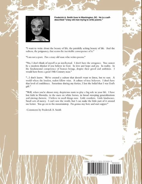 "I want to write about the beauty of life. About the aching, painful beauty of life. And the sadness, the poignancy, that seems to be its inseparable companion." Thus we introduce, with his own words, a new poetry collection by a unique voice. Frederick A. Smith looks at American culture and is not pleased. He proposes to his readers a gentler, wiser alternative to the hyper-competitive, hyper-violent world we have made. Born in California, with deep family roots in the Hawaiian Islands, Mr. Smith displays an exquisite lyricism, a simple, clean style, and a deep love of life. His is an island perspective; his time flows slower than ours, his voice is softer. His themes embrace the rejection of striving, of progress, in favor of a sensuous new deal, in which love, in all its aspects, replaces acquisition and power as our goals.