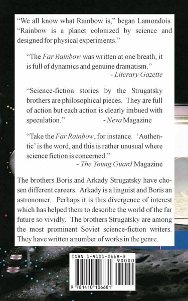 "We all know what Rainbow is," began Lamondois. "Rainbow is a planet colonized by science and designed for physical experiments." "The Far Rainbow was written at one breath, it is full of dynamics and genuine dramatism." - Literary Gazette "Science-fiction stories by the Strugatsky brothers are philosophical pieces. They are full of action but each action is clearly imbued with speculation." - Neva Magazine "Take the Far Rainbow, for instance. 'Authentic' is the word, and this is rather unusual where science fiction is concerned." - The Young Guard Magazine The brothers Boris and Arkady Strugatsky have chosen different careers. Arkady is a linguist and Boris an astronomer. Perhaps it is this divergence of interest which has helped them to describe the world of the far future so vividly. The brothers Strugatsky are among the most prominent Soviet science-fiction writers. They have written a number of works in the genre.