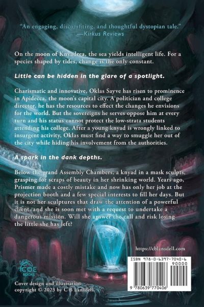 On the moon of Knyadrea, the sea yields intelligent life. For a species shaped by tides, change is the only constant. Little can be hidden in the glare of a spotlight. Charismatic and innovative, Oklas Sayve has risen to prominence in Apidecca, the moon's capital city. A politician and college director, he has the resources to effect the changes he envisions for the world. But the sovereigns he serves oppose him at every turn and his status cannot protect the low-strata students attending his college. After a young knyad is wrongly linked to insurgent activity, Oklas must find a way to smuggle her out of the city while hiding his involvement from the authorities. A spark in the dank depths. Below the grand Assembly Chambers, a knyad in a mask sculpts, grasping for scraps of beauty in her shrinking world. Years ago, Prismer made a costly mistake and now has only her job at the projection booth and a few special interests to fill her days. But it is not her sculptures that draw the attention of a powerful client, and she is soon met with a request to undertake a dangerous mission. Will she answer the call and risk losing the little she has left? Mysteries surface. A supernatural substance is used in corrupt ways. As identities shift and predicaments are reshuffled, what alliances might be forged?