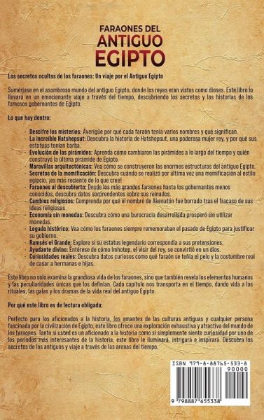 Los secretos ocultos de los faraones: Un viaje por el Antiguo Egipto Sumérjase en el asombroso mundo del antiguo Egipto, donde los reyes eran vistos como dioses. Este libro lo llevará en un emocionante viaje a través del tiempo, descubriendo los secretos y las historias de los famosos gobernantes de Egipto. Lo que hay dentro: Descifre los misterios: Averigüe por qué cada faraón tenía varios nombres y qué significan. La increíble Hatshepsut: Descubra la historia de Hatshepsut, una poderosa mujer rey, y por qué sus estatuas tenían barba. Evolución de las pirámides: Aprenda cómo cambiaron las pirámides a lo largo del tiempo y quién construyó la última pirámide de Egipto. Maravillas arquitectónicas: Vea cómo se construyeron las enormes estructuras del antiguo Egipto. Secretos de la momificación: Descubra cuándo se realizó por última vez una momificación al estilo egipcio, ¡es más reciente de lo que cree! Faraones al descubierto: Desde los más grandes faraones hasta los gobernantes menos conocidos, descubra datos sorprendentes sobre sus reinados. Cambios religiosos: Comprenda por qué el nombre de Akenatón fue borrado tras el fracaso de sus ideas religiosas. Economía sin monedas: Descubra cómo una burocracia desarrollada prosperó sin utilizar monedas. Legado histórico: Vea cómo los faraones siempre rememoraban el pasado de Egipto para justificar su gobierno. Ramsés el Grande: Explore si su estatus legendario correspondía a sus pretensiones. Ayudante divino: Entérese de cómo Imhotep, el visir del rey, se convirtió en un dios. Curiosidades reales: Descubra datos curiosos como qué faraón se teñía el pelo y la costumbre real de casar a hermanas e hijas. Este libro no solo examina la grandiosa vida de los faraones, sino que también revela los elementos humanos y las peculiaridades únicas que los definían. Cada capítulo nos transporta en el tiempo, dando vida a los rituales, las galas y los dramas de la vida real del antiguo Egipto. Por qué este libro es de lectura obligada: Perfecto para los aficionados a la historia, los amantes de las culturas antiguas y cualquier persona fascinada por la civilización de Egipto, este libro ofrece una exploración exhaustiva y atractiva del mundo de los faraones. Tanto si usted es un aficionado a la historia como si simplemente siente curiosidad por uno de los periodos más interesantes de la historia, este libro le iluminará, intrigará e inspirará. Descubra los secretos de los antiguos y viaje a través de las arenas del tiempo.