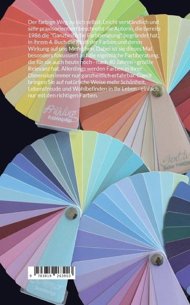 Der farbige Weg zu sich selbst. Leicht verständlich und sehr praxisorientiert beschreibt die Autorin, die bereits 1986 die "Ganzheitliche Farbberatung" begründet hat, in ihrem 4. Buch die Kraft der Farben und deren Wirkung auf uns Menschen. Dabei ist sie dieses Mal besonders fokussiert auf die eigentliche Farbberatung, die für sie auch heute noch - nach 40 Jahren - größte Relevanz hat. Allerdings werden Farben in ihrer Dimension immer nur ganzheitlich erfahrbar. Damit bringen Sie auf natürliche Weise mehr Schönheit, Lebensfreude und Wohlbefinden in Ihr Leben - einfach nur mit den richtigen Farben.