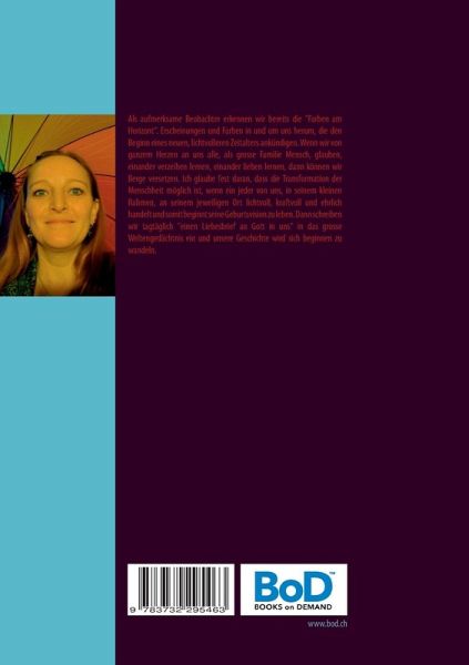 Als aufmerksame Beobachter erkennen wir bereits die "Farben am Horizont". Erscheinungen und Farben in und um uns herum, die den Beginn eines neuen, lichtvolleren Zeitalters ankündigen. Wenn wir von ganzem Herzen an uns alle, als grosse Familie Mensch, glauben, einander verzeihen lernen, einander lieben lernen, dann können wir Berge versetzen. Ich glaube fest daran, dass die Transformation der Menschheit möglich ist, wenn ein jeder von uns, in seinem kleinen Rahmen, an seinem jeweiligen Ort lichtvoll, kraftvoll und ehrlich handelt und somit beginnt seine Geburtsvision zu leben. Dann schreiben wir tagtäglich "einen Liebesbrief an Gott in uns" in das grosse Weltengedächtnis ein und unsere Geschichte wird sich beginnen zu wandeln.