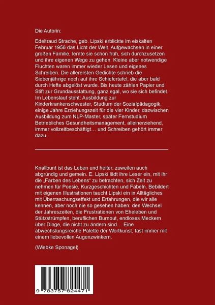 Die bunte Vielfalt des Lebens von Menschen wie du und ich oder ganz anderen, fantasievoll bis skurril, nachdenklich bis abgründig, liebevoll ironisch bis vergnüglich leicht; dargestellt und beschrieben in Gedichten, Poetry-Slam-Texten und Kurzgeschichten; bestens geeignet zum Vorlesen und Verschenken, auf alle Fälle jedoch zum Selbstgenießen.