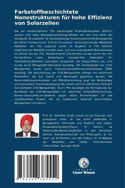 Die auf nanokristallinem TiO2 basierenden Farbstoffsolarzellen (DSSCs) weisen eine hohe Energieumwandlungseffizienz auf und sind einer der häufigsten Ersatzstoffe für kostengünstige Solarenergieumwandlungsgeräte bei hohen Temperaturen. ZnO ist ein weiterer vielversprechender Metalloxid-Halbleiter, der TiO2 aufgrund seiner im Vergleich zu TiO2 höheren elektronischen Mobilität ersetzen kann, und sein Leitungsband-Energieniveau ist ähnlich wie bei TiO2. Nanokristalline ZnO-Partikel wurden durch das Sol-Gel-Verfahren unter Verwendung mesoporöser Elektroden für farbstoffsensibilisierte Solarzellen hergestellt. Die Anatas-Phase von ZnO wurde durch Röntgendiffraktometrie bestätigt. Die Partikelgröße der ZnO-Nanopartikel wurde durch Transmissionselektronenmikroskopie (TEM) bestätigt. Die Beschichtung der ZnO-Nanopartikel erfolgte mit natürlichen Farbstoffen, die aus Spinat und Mariengold gewonnen wurden. Die Rasterelektronenmikroskop- und EDX-Untersuchung zeigt die Morphologie und elementare Zusammensetzung der reinen und mit natürlichem Farbstoff beschichteten ZnO-Nanopartikel. Tauc's Plot bestätigte die Verringerung der Bandlücke von ZnO-Nanopartikeln mit natürlicher Farbstoffbeschichtung. Raman-Streuspektrum-Spektren zeigen aktive Phononmoden für alle synthetisierten Proben. Die mit natürlichem Farbstoff beschichteten Nanopartikel sind besser.