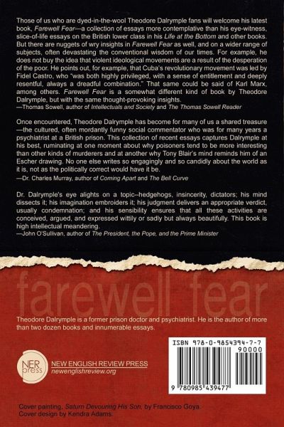 Farewell Fear is a collection of Theodore Dalrymple's finest essays written for New English Review between 2009 and 2012. His first such collection was Anything Goes (2011). Once encountered, Theodore Dalrymple has become for many of us a shared treasure-the cultured, often mordantly funny social commentator who was for many years a psychiatrist at a British prison. This collection of recent essays captures Dalrymple at his best, ruminating at one moment about why poisoners tend to be more interesting than other kinds of murderers and at another why Tony Blair's mind reminds him of an Escher drawing. No one else writes so engagingly and so candidly about the world as it is, not as the politically correct would have it be. -- Dr. Charles Murray author of Coming Apart and The Bell Curve