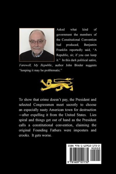 Farewell, My Republic is a surreal political satire. To reduce crime, the President and Congress inaugurate various illegal acts, including domestic bombing. A constitutional crisis and convention destroy the republic, replacing it with a thinly disguised, divine right monarchy.