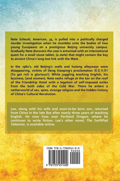 Nate Scheutt, American, 35, is pulled into a politically charged murder investigation when he stumbles onto the bodies of two young Europeans on a prestigious Beijing university campus. Gradually Nate discovers the case is entwined with an international quest for a small stone tablet, (a stele) that might contain the key to ancient China's long-lost link with the West. In the 1980's, old Beijing's walls and hutong alleyways were disappearing, victims of Deng Xiaoping's proclamation ¿¿¿ ¿!(To get rich is glorious!). While juggling teaching English, his business, (and women), Nate seeks refuge…mehr
