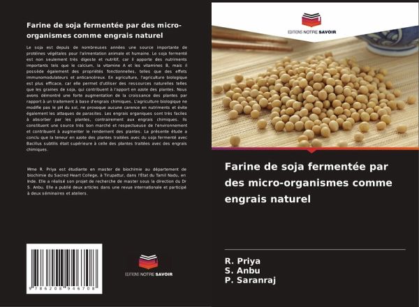 Le soja est depuis de nombreuses années une source importante de protéines végétales pour l'alimentation animale et humaine. Le soja fermenté est non seulement très digeste et nutritif, car il apporte des nutriments importants tels que le calcium, la vitamine A et les vitamines B, mais il possède également des propriétés fonctionnelles, telles que des effets immunomodulateurs et anticancéreux. En agriculture, l'agriculture biologique est plus efficace, car elle permet d'utiliser des ressources naturelles telles que les graines de soja, qui contribuent à l'apport en azote des plantes. Nous avons démontré une forte augmentation de la croissance des plantes par rapport à un traitement à base d'engrais chimiques. L'agriculture biologique ne modifie pas le pH du sol, ne provoque aucune carence en nutriments et évite également les attaques de parasites. Les engrais organiques sont très faciles à absorber par les plantes, contrairement aux engrais chimiques. Ils constituent une source très bon marché et respectueuse de l'environnement et contribuent à augmenter le rendement des plantes. La présente étude a conclu que la teneur en azote des plantes traitées avec du soja fermenté avec Bacillus subtilis était supérieure à celle des plantes traitées avec des engrais chimiques.