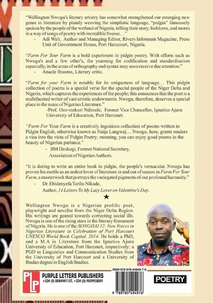 "Wellington Nwogu's literary artistry has somewhat strengthened our emerging new genre in literature by plainly weaving the simplistic language, "pidgin" famously spoken by the people of the wetland of Nigeria, telling their story, folklores, and mores in a way of songs of poetry with incredible finesse..." - Adi Wali, Author and Managing Editor, Rivers Informant Magazine, Press Unit of Government House, Port Harcourt, Nigeria. "Farm For Your Farm is a bold experiment in pidgin poetry. With efforts such as Nwogu's and a few other's, the yearning for codification and standardisation especially, in the areas of orthography and syntax may soon receive due attention." - Anaele Ihuoma, Literary critic. "Farm for your Farm is notable for its uniqueness of language... This pidgin collection of poems is a special verse for the special people of the Niger Delta and Nigeria, which captures the experiences of the people; this announces that the poet is a multifaceted writer of vast artistic endowments. Nwogu, therefore, deserves a special place in the maze of Nigerian Literature." - Prof. Ozo-mekuri Ndimele, Former Vice Chancellor, Ignatius Ajuru University of Education, Port Harcourt. "Farm For Your Farm is a creatively ingenious collection of poems written in Pidgin English, otherwise known as Naija Langwej... Nwogu, here, grants readers a visa into the vista of Pidgin Poetry; meaning, you can enjoy good poems in the beauty of Nigerian parlance." - BM Dzukogi, Former National Secretary, Association of Nigerian Authors. "It is daring to write an entire book in pidgin, the people's vernacular. Nwogu has proven his mettle as an ardent lover of literature in and out of season in Farm For Your Farm, a masterwork that portrays the variegated pigments of our profound humanity." - Dr. Ebidenyefa Tarila-Nikade, Author, 14 Letters To My Lazy Lover on Valentine's Day.