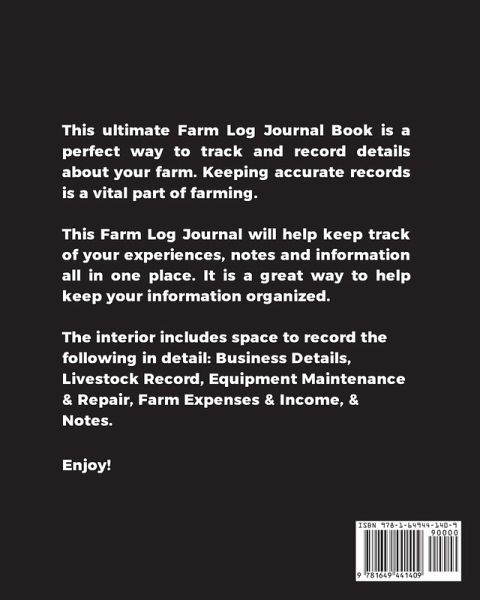 This unique farm management record book, organizer is a perfect way to keep track of your business homestead. It will be great to help keep all your farming, bookkeeping & important records information all in one place. If you're a planner, this is a must have. The interior of this notebook includes prompts & space to write: Contact Page - Write your Name, Address, Phone Number, Start & End Dates of this Record. Business Details - Write Business Name, Address, Email, Fax, Phone, Website, Logbook Details, & Notes. Livestock Record - Date, Number, Type, Start & End: Quantity, Average Weight, Value, Balance. Equipment Maintenance & Repair - Date, Month, Equipment, Inspection, Maintenance, Repair, Services Required, Date of Service or Repair Farm Expenses - Date, Expenses, Cost, Remarks Farm Income - Date, Source, Description, Method of Payment, Amount Notes - Any other important information you wish to record such as farms inventory, garden plan, goat tracker, monthly notes, accounting notes, financial note & records, etc. This notebook will be a great resource note to look back on. Makes a wonderful gift for busy ranchers & farmers, farm living folks, and planners. Journals & logbooks help keep all your planning and important information all in one place. Size is 8x10 inches, 146 pages, soft matte finish cover, quality white paper, black ink, paperback, farm design.