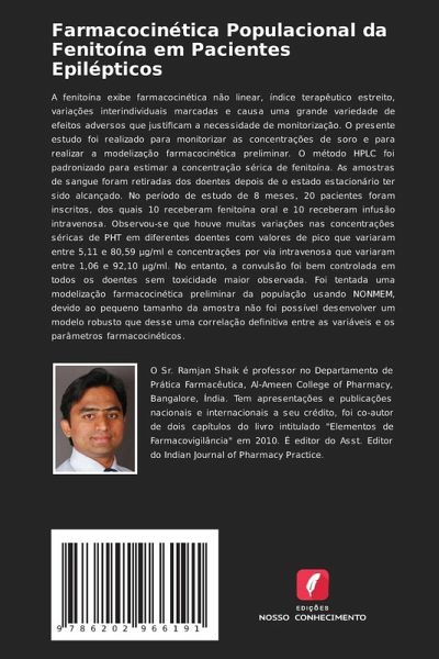 A fenitoína exibe farmacocinética não linear, índice terapêutico estreito, variações interindividuais marcadas e causa uma grande variedade de efeitos adversos que justificam a necessidade de monitorização. O presente estudo foi realizado para monitorizar as concentrações de soro e para realizar a modelização farmacocinética preliminar. O método HPLC foi padronizado para estimar a concentração sérica de fenitoína. As amostras de sangue foram retiradas dos doentes depois de o estado estacionário ter sido alcançado. No período de estudo de 8 meses, 20 pacientes foram inscritos, dos quais 10 receberam fenitoína oral e 10 receberam infusão intravenosa. Observou-se que houve muitas variações nas concentrações séricas de PHT em diferentes doentes com valores de pico que variaram entre 5,11 e 80,59 µg/ml e concentrações por via intravenosa que variaram entre 1,06 e 92,10 µg/ml. No entanto, a convulsão foi bem controlada em todos os doentes sem toxicidade maior observada. Foi tentada uma modelização farmacocinética preliminar da população usando NONMEM, devido ao pequeno tamanho da amostra não foi possível desenvolver um modelo robusto que desse uma correlação definitiva entre as variáveis e os parâmetros farmacocinéticos.