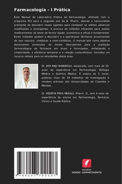 Este Manual de Laboratório Prático de Farmacologia, alinhado com o programa PCI para o segundo ano da B. Pharm, aborda a necessidade premente de descobrir novos agentes para combater os efeitos adversos modificados e emergentes. A procura de métodos eficientes para avaliar medicamentos de teste de forma rápida, económica e eficaz é fundamental. Estes métodos ajudam a descobrir e a aperfeiçoar fármacos provenientes de vias naturais, sintéticas e semi-sintéticas. O manual tem como objetivo desenvolver protocolos de testes laboratoriais para a avaliação farmacológica de fármacos em bruto e formulados, enfatizando a simplicidade, a eficiência temporal e a relação custo-eficácia. Constitui um recurso valioso para os estudantes desta área.
