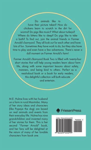 Do animals like to have their picture taken? How do chickens learn to scratch in the dirt for worms? Do pigs like music? What about turkeys? Where do kittens like to sleep? Do pigs like to take a bath? To find out, join the animal friends in Farmer Arnold's barnyard. They all look out for each other and have lots of fun. Sometimes they have work to do, but they also have time to play and even have a few adventures. There's never a dull moment on Farmer Arnold's farm! Farmer Arnold's Barnyard Book Two is filled with twenty-four short stories that will help young readers learn about farm life, along with some important lessons about safety, manners, and being kind to others. Perfect as a read-aloud book or a book for early readers, this delightful collection will both educate and entertain.