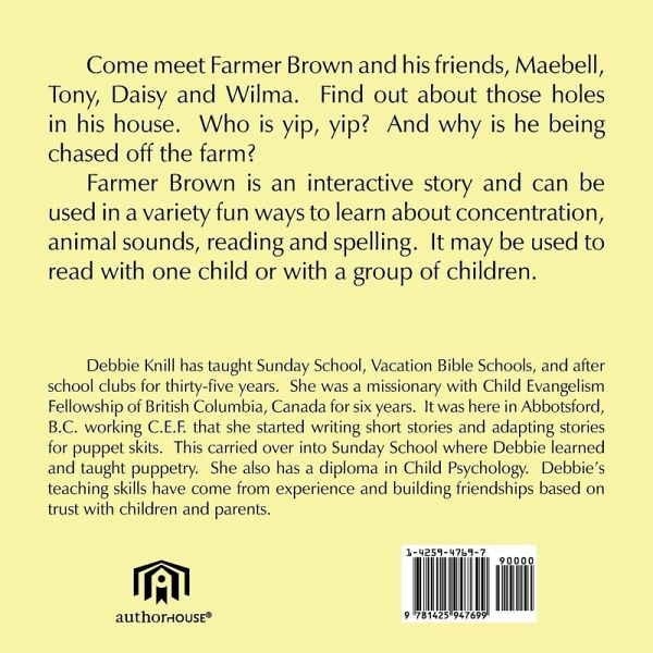 Come meet Farmer Brown and his friends, Maebell, Tony, Daisy and Wilma. Find out about those holes in his house. Who is yip, yip? And why is he being chased off the farm? Farmer Brown is an interactive story and can be used in a variety fun ways to learn about concentration, animal sounds, reading and spelling. It may be used to read with one child or with a group of children.