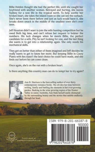 Billie Holden thought she had the perfect life, until she caught her boyfriend with another woman. Betrayed and hurting, she leaves Sydney for a new life in the tropical north. To help soothe her broken heart, she takes the inland route so she can see the outback. She's never been there before and just as luck would have it, she breaks down smack in the middle of the smallest town she's ever seen. Jeff Houston didn't want to join the wife hunting competition but he owed Beth big time, and can't refuse her request to bolster the numbers. His luck changes when he meets Billie, the perfect candidate for a wife. Pity he isn't looking for one, and the last thing she wants is to get into a relationship again. She only needs his mechanical skills. They get on better than either of them imagined and Jeff decides he really wants to get to know her more. But keeping Billie in Casey Plains with lies wasn't the best choice he could have made, and she finds out before he can come clean. Once again, she's on the run with a broken heart. Is there anything this country man can do to tempt her to try again?