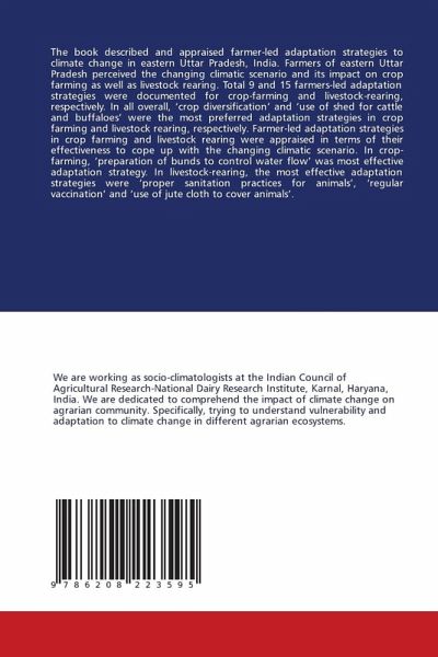 The book described and appraised farmer-led adaptation strategies to climate change in eastern Uttar Pradesh, India. Farmers of eastern Uttar Pradesh perceived the changing climatic scenario and its impact on crop farming as well as livestock rearing. Total 9 and 15 farmers-led adaptation strategies were documented for crop-farming and livestock-rearing, respectively. In all overall, 'crop diversification' and 'use of shed for cattle and buffaloes' were the most preferred adaptation strategies in crop farming and livestock rearing, respectively. Farmer-led adaptation strategies in crop farming and livestock rearing were appraised in terms of their effectiveness to cope up with the changing climatic scenario. In crop-farming, 'preparation of bunds to control water flow' was most effective adaptation strategy. In livestock-rearing, the most effective adaptation strategies were 'proper sanitation practices for animals', 'regular vaccination' and 'use of jute cloth to cover animals'.